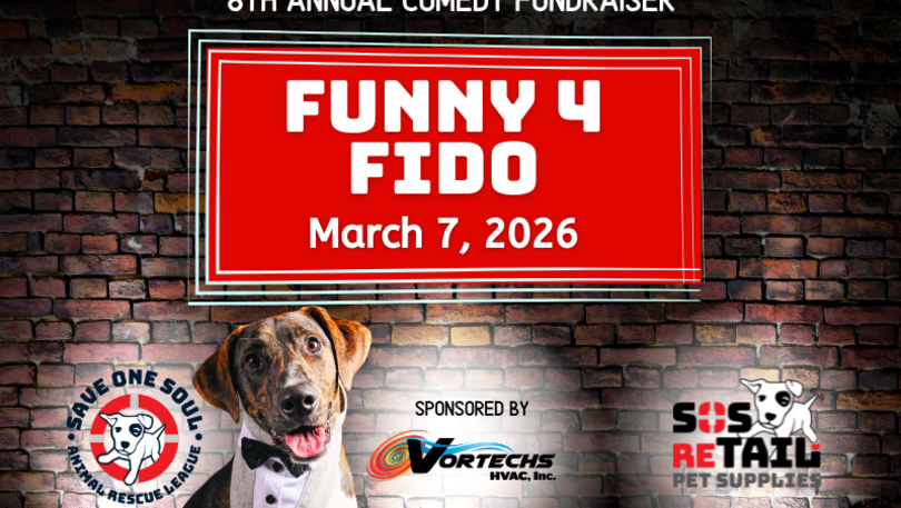 Join Save One Soul Animal Rescue League (SOSARL) for our 8th Annual Funny-4-Fido Night, a dinner and comedy fundraising event supporting homeless and abandoned dogs. Enjoy an evening of laughter, great food, exciting raffle baskets, and a silent auction. If you’re unable to attend, we invite you to consider making a donation. Every contribution is never too large or too small, 100% of the proceeds from this event directly support our mission to give dogs a second chance at a loving and happy life.