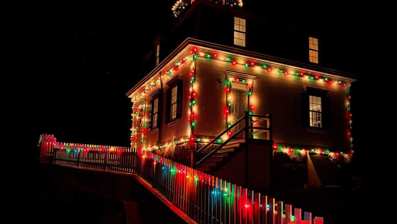 Come see a lighthouse all dressed up for the season. Pomham Rocks Lighthouse, located on an island off the coast of Riverside, is known for its bright red beacon that shines on Narragansett Bay. But this holiday season, the light station will cast an even brighter glow. And you won’t need a boat to see it. Members of Friends of Pomham Rocks Lighthouse have taken advantage of the mild fall weather to string over a thousand colored lights on the century-and-a-half-year-old landmark to herald the holiday season. From the top to the bottom of the lighthouse and all around the island, the historic site will shine for the festive season.