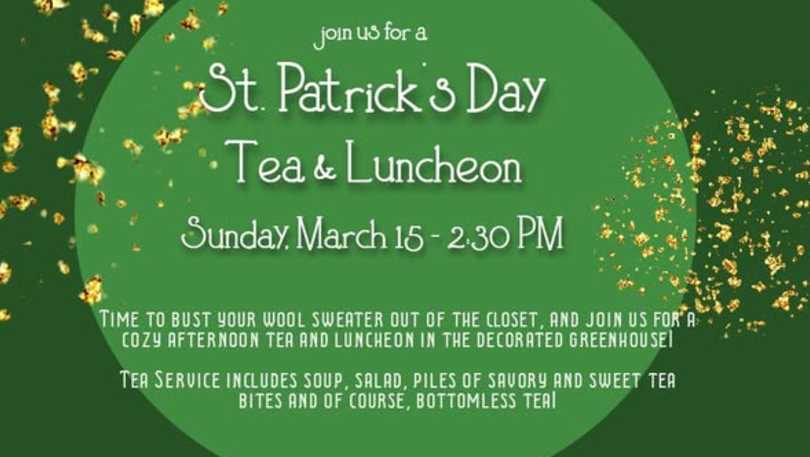 If St. Patrick's Day isn't a drinking holiday for you, try drinking a cup of tea instead! Time to bust your wool sweater out of the closet, and join us for a cozy afternoon tea and luncheon in the decorated greenhouse! You and your friends will get a chance to chit chat and catch up while you enjoy all of the classic tastes of the holiday without any of the pub chaos. Your full tea and luncheon will served with bottomless tea in fancy cups, followed by stacks of delicious desserts.