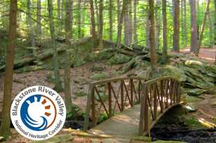 The trail Head is located on Old Forge Road between Farnum Pike (Route 104) and Log Road just north of Stump Pond. Parking is across the street from the trail sign. The entrance to this park is the most magnificent part of the park, with a beautiful rock ledge overhanging a lively stream and scenic footbridge.