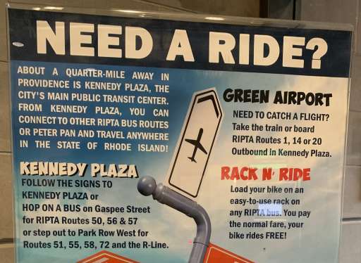 Kennedy Plaza is Providence's main public transit center. From there, you can make connections to RIPTA routes or Peter Pan buses to travel anywhere in the state. If you need to go to Green (PVD) Airport, you can take routes 1, 14 or 20 from Kennedy Plaza. If you want to head to Newport, you can take route 60 outbound from Kennedy Plaza. Once in Newport, routes 63, 64, 67 or the 231 South Aquidneck Flex will take you around the City by the Sea. You can't get to Block Island by bus, but you can get to the Block Island Ferry by bus! Take route 66 outbound from Kennedy Plaza to the Galilee State Pier. By the way, taking the bus doesn't mean leaving your bike behind. You can rack-n-ride on any RIPTA bus - and your bike rides for free!